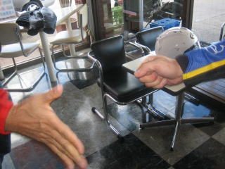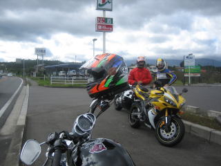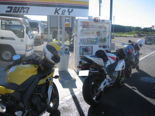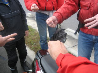 9:57 ジャンケンタイム 給油と言えば、当然ジャンケン。 そして、先ほどからクシタニのジャンバーを着ている・・・・裏の写真のワケさんの負け! たいがい初登場の人って負けるんですよね(笑) |