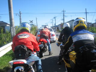 8:41 布佐の踏切 K2Yを出発して、国道16号線を北上し、途中千葉ニュータウンを経由して、成田線布佐駅近くの踏切まできました。 ここではアイスエイジさんのドカを先頭にオパミンのCBR954、コシドラちゃんのCBR1000RR、そしてワケさんR1と続きます。 ここから県道4号千葉竜ヶ崎線の利根川に架かる栄橋を渡り、茨城県に入り常磐の土浦北ICまで一般道を走ります。 |