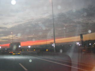 5:29 朝焼け 首都高を走行中、朝陽が出てきました。 朝焼けは燃えるような赤い色、ちょっと感動的な色をしていたので、写真を1枚。 フロントウインドウ越しだったので、ガラスがかぶっちゃっていました。(残念) |