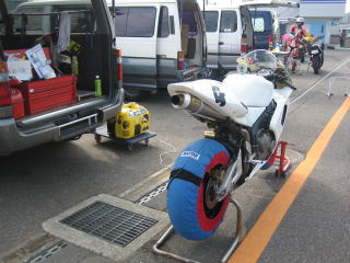 8:58 タイヤウォーマー 今回はオパミンからタイヤウォーマーを借りてきました。 タイヤウォーマーの威力は6月のモテギの走行会で体験済です。 今日は新品タイヤでの走り出しです。 タイヤウォーマーを使うと1周目からどの位グリップするのか確認するよう走ります。 |