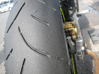 12:39 フロントタイヤ 走行前は新品でしたので、あえて写真を撮ることもないので、割愛。 30分の走行を2本終えた状態のフロントタイヤです。 荒れた感じもなく、ハンドルをこじった様な気配もなく、綺麗に摩耗しているようです。 |