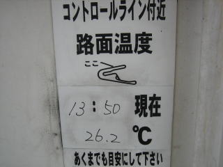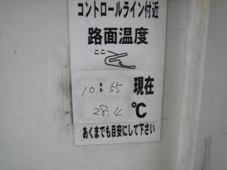 12:15 コンディション 1走行目は20分遅れの10:25〜10:45、走行後のコンディションです。 天候→晴れ 路面→ドライ 気温22.2℃ 路面温度28.4℃ 寒いことはないので、まずまずのコンディションだと思います。 |