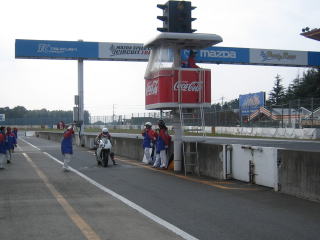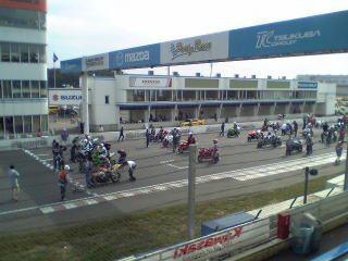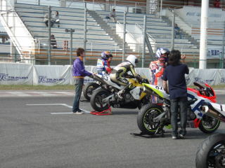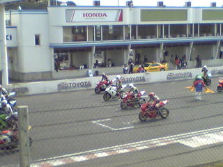 10:55 選手紹介 決勝5分前、グリッドにバイクを並べ選手紹介です。 2列目の向こうから2番目の白いバイクが自分です。 (写真はオベリスクさんから) |