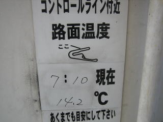 10:29 手持ちぶさたなので で、バイクはヘルパーの2人が面倒を見てくれているので、やることがなく、手持ちぶさたなので、また気温と路面温度の写真を撮りにきました。 気 温 19.9℃ 路面温度 23.4℃ 決勝までにもう少し上がるでしょう。 |