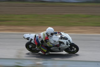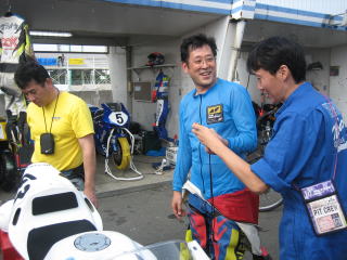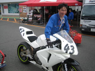 10:44 目は笑って ライダースブリーフィングが終わり、いよいよコースにバイクを並べる準備を始めます。 目は笑っていますが、気持ちの余裕はありません。(^^;) 少し(かなり?)緊張して”良い具合”にアドレナリンが出て、体が暑いです。顔も赤いです。 (良い具合かどうかは、決勝で明らかに!) |