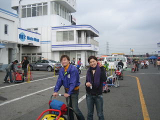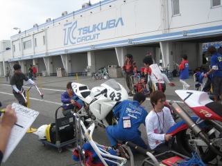 10:25 タイヤを保温する 決勝前のチェックを行ったあと、決勝までの間タイヤが冷えないようにタイヤウォーマーを運びます。 運んでくれたのは、まるえさんとひろみちゃん。 手に持っているのは、たばこでは? (パドック内は禁煙ですよー) |