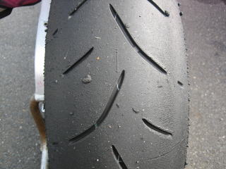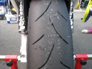 11:24 走行後 予選、約14周、決勝14周したタイヤ。 表面はさらっとしていて、まだまだ行けそう、当然使い切っていません。 まだまだ、練習が足りませんね。 |