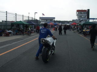 7:42 コンディション 予選前のコンディションです。 天候→晴れ 路面→ドライ 気温→反射が強くて今となっては読めません。(*_*) 路面温度14.2℃ ちょっと低いですが、予選の始まる8時までにはもう少し上がるはずです。 予選の20分前に、写真を撮りに歩き回っているほど余裕があるかと言うと、そうではなく、バイクはヘルパーのみんなが準備してくれるので手持ちぶさたで写真でも撮っていないと落ち着かないと言った方が良いような状態です。 |