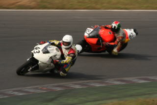 11:00 決勝スタート(直前) いよいよ決勝スタートです。 グリッド2列目、イン側から2番目。 1列目の3,4番手の間から1コーナーが見えます。 スタートで3、4番手を抜けば、3番手ぐらいで1コーナーに入れそう。 1コーナーが自分に「おいでおいで」をしています。 グリッドに全車整列が完了しました。 そして、赤旗を持ったオフィシャルがコースから出て行きます。 アクセルをあおります。 タワーのシグナル、レッド点灯! クラッチミーーーーート。って やっちゃったぁ !!!(滝汗) 思いっきり、ジャンプスタート。 シグナルレッド消灯→スタート(正解)を、レッドシグナルが点灯した瞬間クラッチミートしちゃいましたぁあ。 で、ブレーキしたけど当然手遅れ。 (写真はオベリスクさんから) |