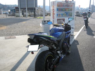 10:33 側道を移動中 K2Yを出発して、まずは国道16号を千葉方面に南下し、途中から左折して京葉道路の側道を走ります。 信号待ちで、ちょっと停止。 ロッシカラーに塗られたR1の限定色(?)格好いいです! このあと、途中まで一緒に走っていた、すーさんとはぐれてしまいました。 |