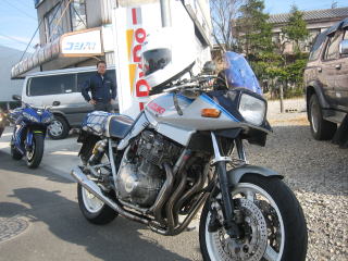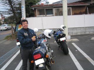 10:01 時間ピッタリに 時間ピッタリに浜田さん到着。 「ハマダさん、明けましておめでとうござます」 自分とは去年の元旦ツーリング以来、一年ぶり、きれいに手入れされたカタナは健在ですね。 |