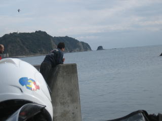 14:02 昼食後は 昼食後は鯛ノ浦のある内浦湾に移動して、腹ごなし。 対岸の山の上に小さく小さく見える白い建物は日蓮宗の誕生寺です。 |