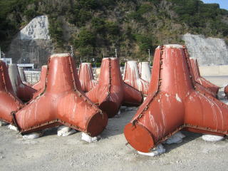 14:08 テトラポット 港の脇の広場に整然と置いてある、でっかい海星(ひとで)みたいなのは、テトラポット。 さび止めを塗られた金属の型枠にコンクリートを流し込んで作るんですね。 |