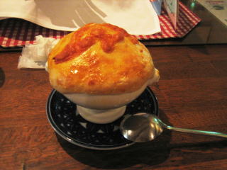 18:41 たまにはちょっと洒落て 普段は圧倒的に和食や中華などが多いですが、たまにはちょっと洒落て洋食など。 まずは、”きのこのスープ”。 パイ?なのかパン?なのか分かりませんが、中はきのこのスープが入っています。 このパンをスープに漬けて食べるのが、美味しいぃ。(*^_^*) |