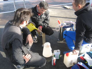 14:26 修理完了 アイスエイジさんのカートの修理が終わりました。 (アイスエイジさんの)カートは2サイクルの混合ガソリン使用なので、早速ガソリンを作ります。 オイルはカストロのA747、混合オイルの定番です。 (最近は4サイクルのカートもあって、混合ガソリンなんて必要ないカートもあるんですね) |