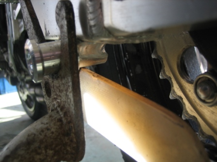 | 21:31 リヤスタンドボルト リヤのスタンドボルトが転倒の勢いで、折れてどっかに行ってしまいました。 リヤスタンドが使用できずに、非常に不自由しました。 オパミンから、サイドスタンドを借りて、とりあえず立てておくことが出来ました。 レースモデルはリヤのスタンドボルトがなくなると、立てておくことが出来ず非常に不便です。 サイドスタンドは持っていた方が良いみたい。 (とりあえずオパミンに借用) |