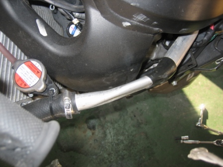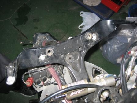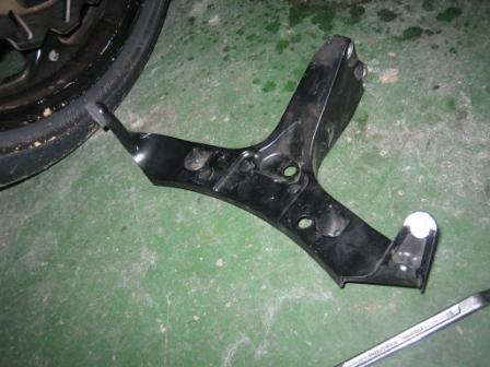 | 17:28 カウルステー 次に、アップカウルのステーの交換。 左の取付け部分が、路面に擦れてねじ山がなくなっていました。 |