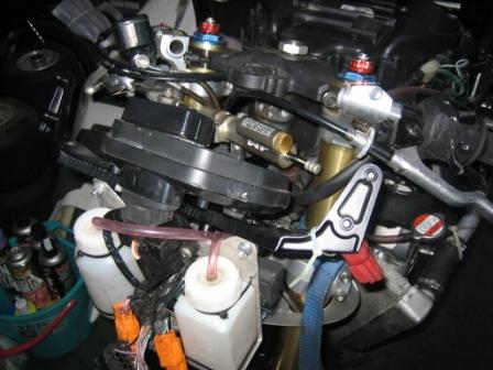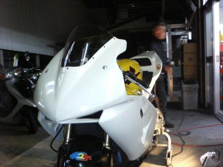 | 22:05 カウル取付け スクリーン取付け後、アッパーカウルを取付けようとしましたが、カウルのステーが曲がっていたため、スポットFRPでは取付けが出来ませんでした。 夜になってから、K2Yに来てステーを新品に交換して、無事カウルの総茶着が終わりました。 |