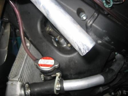 | 21:31 ラジエータパイプ 次にラジエータパイプが転倒で潰れていました。 これも、新品に交換。 ラジエータの付け根が潰れて楕円形になっていました。 これは、適当に叩いて、円形に戻し使用。 |