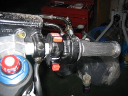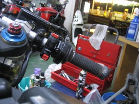 | 20:28 右ハンドル 右側もバーエンドを擦っていますが、もともとスタータスイッチのボルトがバカになっていたので、この機に新品に交換します・ |