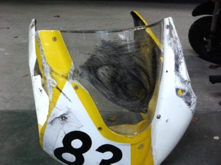 | 2006年12月8日 21:30 アッパーカウル全損 11月17日の練習走行で転倒、右手甲の骨折以来、今日12月8日CBRの修理を開始しました。 右手甲の骨折はまだ付いておらず、工具を握る手に痛みが走ります。(*_*) まずは、アッパーカウルの取外し。 なぜか、スクリーンまで路面に擦っています。 修理不能と言うことで、新品に交換します。 |