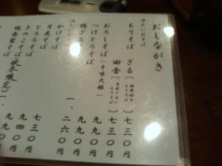 | 12:54 おしながき 前回訪問したときは、平日の夕方で店内は落ち着いた感じで、ちょっと一杯やっているお客さんもいたりして、写真を撮ることは遠慮しましたが、今日は土曜のお昼と言うこともあり、カジュアルな感じ、写真を撮らせてもらうことにしました。 (一人で飲食店に行って、デジカメを出して写真を撮るという行為に、正直ちょっと気が引ける部分が自分はあります) 前置きが長くなりましたが、注文はもりそばの”ざる”と”田舎”を一枚ずつにしました。 接客の女性の人は、”ざる”を先にするか”田舎”を先に出すかも聞かずに注文を聞いていってしまいました。 普通と言うか、ちょっと気の利いたお店ですと、両方同時に出すと蕎麦が延びるので、どっちを先にだすか聞いてくるものですが? |