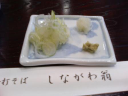 | 12:55 薬味などを 蕎麦が出てくるまでの間、少々手持ちぶさたなので、薬味などを紹介してみましょう。 ねぎと大根おろし、それに山葵、あまりにも定番です。 が、どれも丁寧に作られていて、長ネギは薄く刻まれ、大根おろしはきちっとおろし汁が切ってありました。 山葵は当然、本物。 |