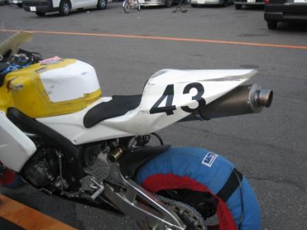 | 8:02 ゼッケン43 CBRを買ったとき、オパミンが使っていたゼッケン「83番」が付いていましたが、転倒でリヤカウルを修理したので、取ってしまいました。 今度は自分のゼッケン(希望)「43番」を付けました。 |