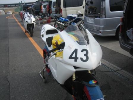 | 8:03 さあ、シーズンの始まりです。 最後におニューのアッパーカウルにもゼッケン”43番”を貼付けて、さあ2008年シーズンの始まりです。 って、のんきに準備している場合じゃありませんでした。 走行時間が始まっちゃってます。 走行時間が始まっているにもかかわらず、タイヤーウォーマーも外していません。 カウルの装着に手間取り、10分ほどタイムロスです。 写真なんて撮ってちゃダメですよ〜。 |