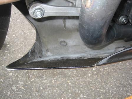 | 8:40 アンダーカウルの裏にも アンダーカウルを取り外して、内側をチェック。 多量ではありませんが、オイルが付着してました。 もっと多量に漏れていて、自分でそのオイルを踏んで”転倒”とかにならなくてラッキーでした。 やはり、大きな転倒の後は、確認のための試走をした方が安心だと思いました。 |