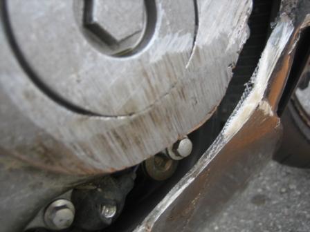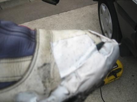 | 8:36 ブーツに 走行終了後、リヤスタンドを掛けるときブーツが少し滑りました。 ブーツの裏にチェーンオイルでも付いていると思い、ブーツを見てビックリ! ブーツ全体に軽くオイルが付着しているではありませんか!! (液体は写真には写り難いですね) オイル漏れです。 |