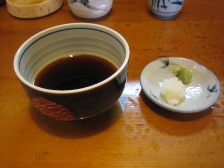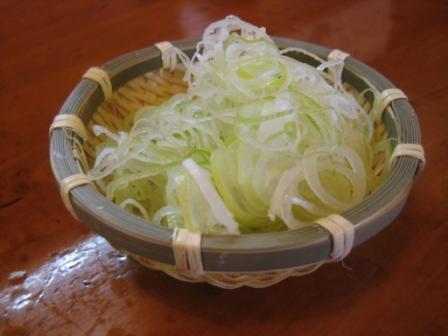 注文がすむと、ザルにドサッと入ったネギを持ってきました。 これは良くないと思います。ネギのきざみ方が荒く、ラーメンに入っているネギの様です。 蕎麦の薬味に使うネギは、蕎麦の風味を殺さないよう、通常は糸の様に出来るだけ細かく切ります。 お店によっては、さらに水にさっと通して刺激臭が出ないようにしているところもあります。 (田舎蕎麦で全体を無骨にまとめようと言う意図でやっているのでしたら、納得しますが) 駿府店では、細く切って出てくるそうです。(男レさん談) |