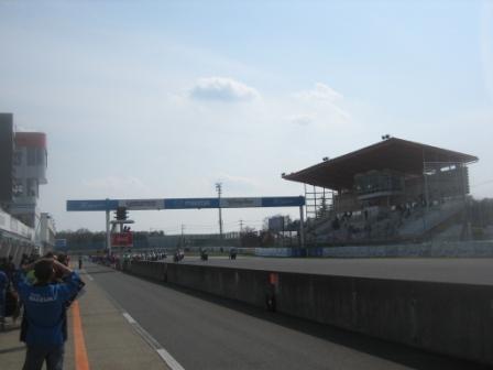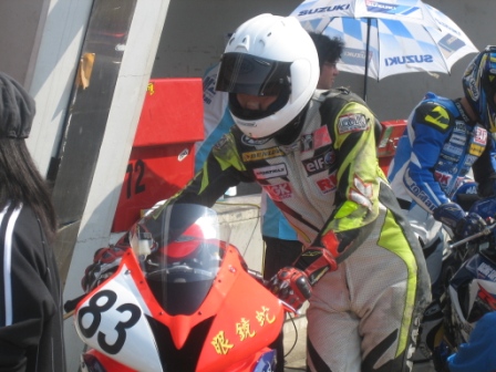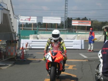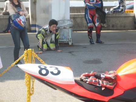 | 14:12 ピット前で ピット前に並んで、タコメータで回転数を確認しながらエンジンを暖気。 これから、コースに出て自分のグリッドに並びます。 ちなみにアッパーカウルに書いてある”眼鏡蛇”は”コブラ”と読むそうじゃ。(ワシには読めんかった) |