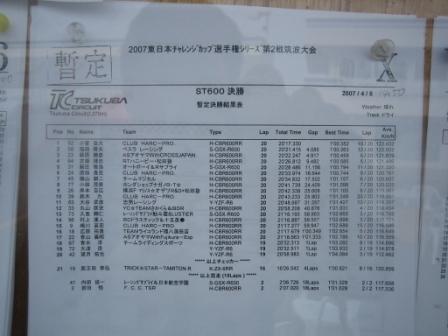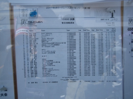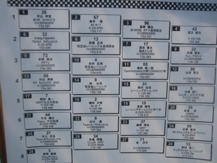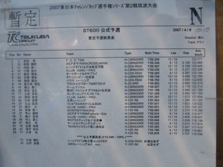 | 10:28 予選結果 予選結果です。が、こっちは去年自分が出場したエントリークラスのTC600。 予選結果を見ると、ポールは1分2秒8! 7位までが1分3秒台です。 TC600はエントリークラスと言うことで足切りタイムがあり、去年までは1分4秒を切ると卒業で次回から出場出来なくなりましたが、今年は1分3秒に変更になりました。 ちなみに、自分のベストは1分4秒09・・・・厳しくなりましたぁ。(^^;) |