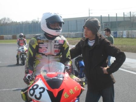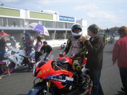 | 14:18 グリッドに着いて 予選13番手、4列目アウト側。 グリッドに着いて、國川選手と作戦会議&アドバイス。 なにやら、笑って見えるのはヘルメットで頬の肉が盛り上がっているせい? |