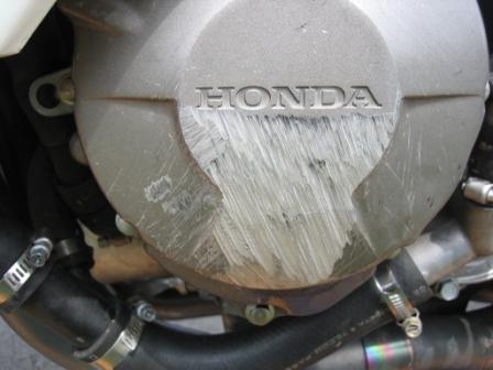 | 9:52 またもオイル漏れ 1走行前にアンダーカウルを装着するときに、カウルの内側にオイルが少し付着しているのを見つけました。 写真のジェネレーターカバーも少しオイルがにじんでいましたが、オイルの出所が見つかりません。 とりあえず量も対したことがないので、オイルを拭き取って、1本目を走行。(このオイル漏れがあり確認しながら走ったので、1走行目の前半のタイムが上がりませんでした。と言い訳) 走行終了後、戻ってきて見てみると、「ありました!」 去年の転倒の時に、擦ったジェネレーターカバーにクラックが入っていました。 ここから、オイルが滲むように漏れていました。 漏れも、にじみ程度で噴くようなことはなさそうなので、とりあえずガムテを貼って2走行目もこれで走ります。 |