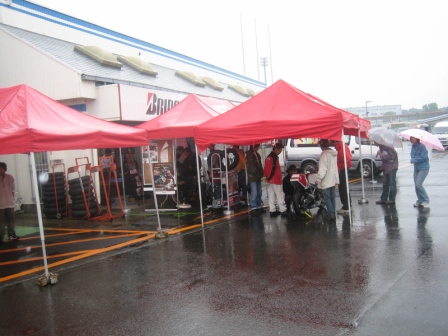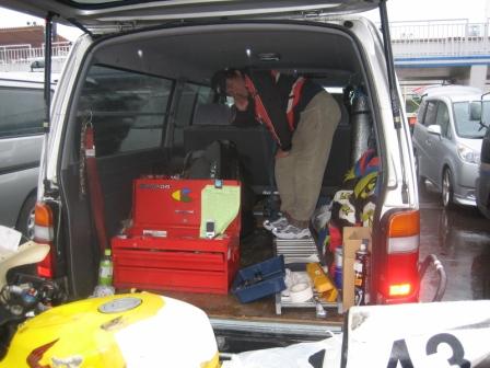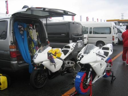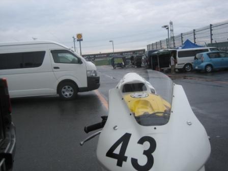 | 8:23 アイスエイジさんは アイスエイジさんは雨が降り続いているので、ハイエースの中で腐ってます。 いままで、さんざんサーキットは走ったので、雨の時までは走りません。 雨やみを待っていますが、そうそうに止みそうもありません。 タイヤも普通(ドライ)のしか履いてませんし・・・・ 逆に自分はレインタイヤを履いて、(雨の中を)走ったことが無いので、ちょうど良いチャーンスと思っています。 |