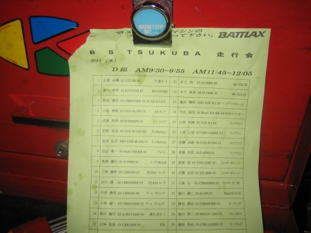 | 7:27 D組は D組の走行は 9:30〜9:55 までと 11:45〜12:05 までの2本になります。 D組は全部で41台エントリーです。 1走行に41台ははっきり言って、1周が2kmしかない筑波では多すぎです。 が、雨が降っていると結構みんな走らないので、空いていて好都合です。 (^^)v |