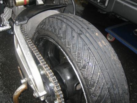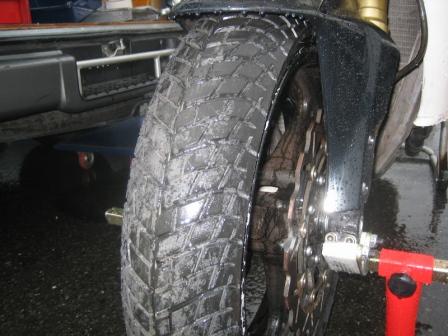 | 8:23 レインタイヤが出来ました レインタイヤが装着されたので、さっそく取付けました。 BSの人に聞いたところ(今更ですが)、レインタイヤの空気圧は標準で1.9キロ、ヘビーレインの時はちょっと高めの2.0キロぐらいだそうです。 で、入替えてもらったレインタイヤの空気圧をチェックすると、3.0キロ! ちゃんとエアー圧を計ることを考えて、たくさん入れておいてくれました。(笑) |