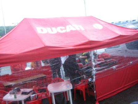 | 10:26 ドカブース 今日もMotoGPをBSで戦っているドカのブースが出典されていました。 流石に試乗会は雨なのでやっていないみたいです。 ※去年はモテギで749Rを試乗させてもらいました。 |