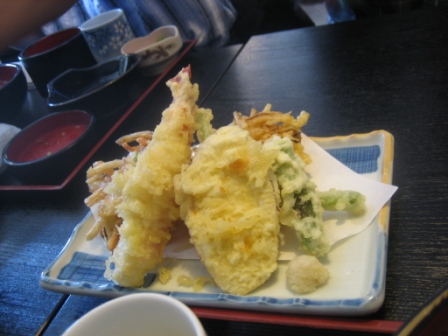 | 12:43 天ぷらも 天ぷらも、”かき揚げ天ぷらそば”ですが、かき揚げにエビ天もイモ、ししとうも付いてきて、ボリュームたっぷり。 後で食べ過ぎで、少々胸焼けをしたほどです。 ついでに、蕎麦のつけ汁と天ぷらのつけ汁が別に供されているところも、気を使っていて良いと思いました。 |