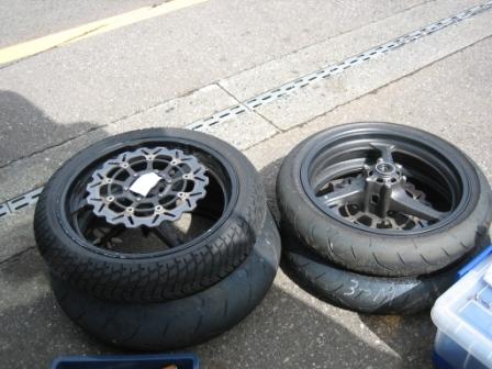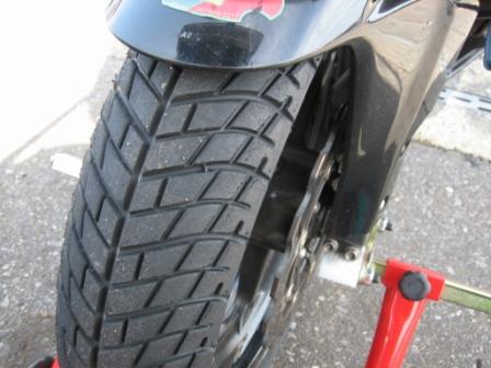 前の右、こっちもリヤタイヤ同様、溝がありません。 最終の立上がりで、アクセルを開けていったとき小さく跳ねるようにフロントが逃げていきました。 結果として、タイヤが滑るので体に無理な力が入っていたり、踏ん張っていたみたいで、翌日は二の腕の外側やモモの内側が久しぶりに筋肉痛でした。 あと、非常に神経を使ったようで、帰宅したときにはクタクタでした。 |