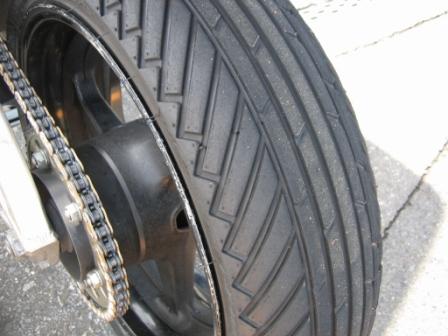 | 12:43 リヤタイヤ右側 終わってます。(-_-;) 走行前の写真とあまり変わりがないですね。 逆に言えば、タイヤをすり減らせるほど荷重やパワーがかけられません。 なので、タイヤカスもあまり出ないので、カスの付着も見られないようです。 |