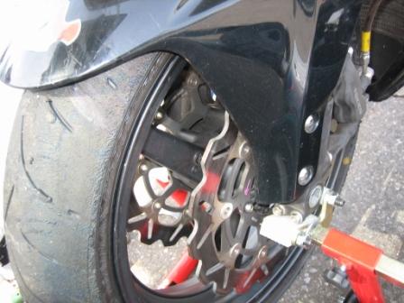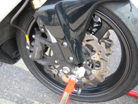 | 9:04 フロント交換完了 交換開始から、36分。 フロントタイヤの交換がおわりました。 慣れれば、普通にやって30分で十分ですね。 ただ、ブレーキは万が一の時にはヤバイので、交換作業はあくまでも慎重に! 組終えた後に、ブレーキ液をちゃんと送っておくことと、ホイルを回してブレーキの動作確認をすること。 変な組み付けしてないか、逆方向に回して確認も。(ってアイスエイジさんからのアドバイス) |