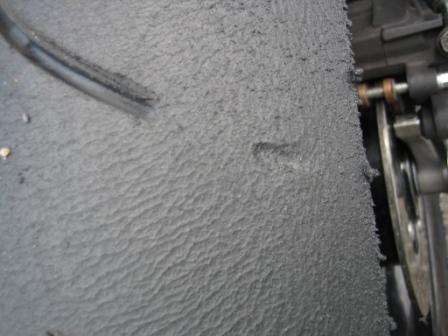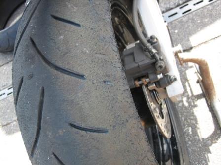 リヤタイヤ左側は、右側に比べてまだ溝が残っています。 筑波は1ヘアピンとMCコーナーの2つしか左コーナーがないので、左の方がタイヤが残っています。 なので、左側はタイヤカスが出ています。 |