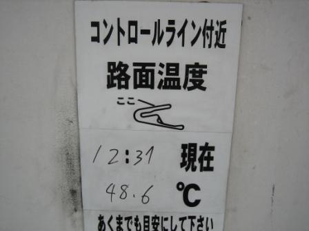 | 12:41 走行後のコンディション 気温27.9℃ 路面温度はなんと 48.6℃ コンディション的にはコンパウンドはハードみたいです。 すり減ったミディアムコンパウンドではグリップしないはずです。 下手は下手なりにタイムは落ちるもんですね。 |