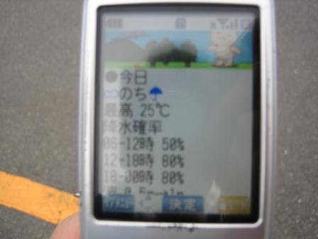 | 6:12 降水確率をチェック 携帯電話から午前中の降水確率をチェックすると、午前中は50%とかなり、かなりやばそう。 昨日の夕方の降水確率は嘘かい? |