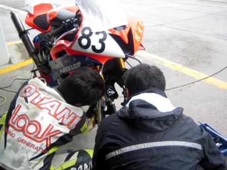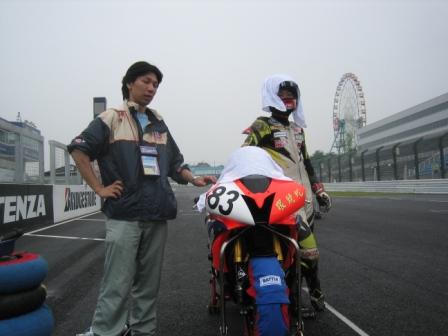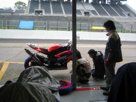 | 10:04 JSB ST600のレース後は、21原さんとJSBを観戦。 オパミンは一人ピットでお片付け。 このころには路面は完全にウェットです。 |