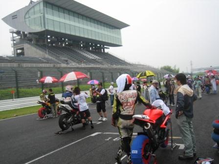 | 8:07 傘忘れました 前を見れば12列。 他のライダーはみんな傘を持ってます。しかも、みんなサーキット専用でけっこうカラフル。 |