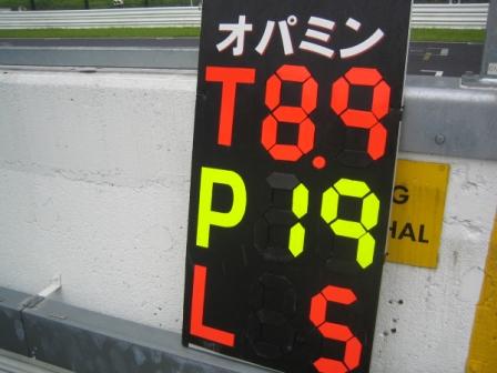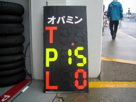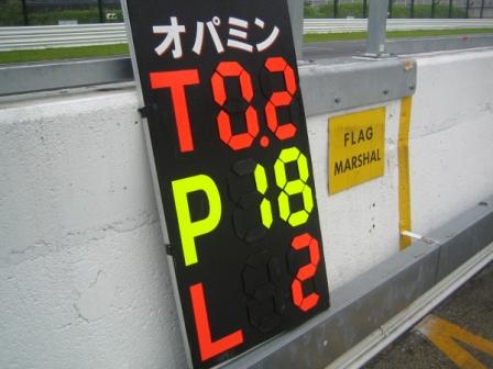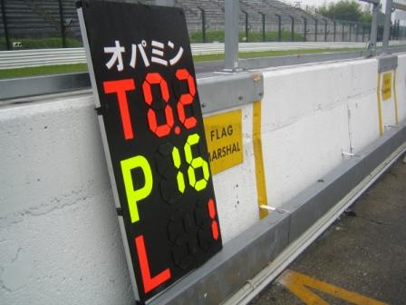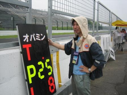 | 8:23 スタートで飛び出して 雨の中、スタートで飛び出して2周目には10台抜いて25番手。 好調です。 21原さんも雨の中、ヤッケ(?)を着込んでサインボードを出します。 |